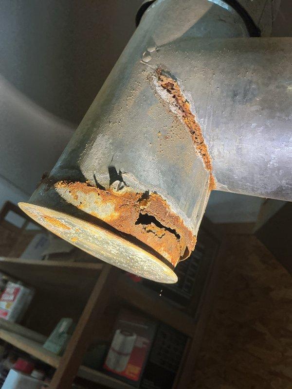 Responded to no heat call on 17-year-old Trane furnace located in workshop behind main residence. Upon inspection, discovered severe rust damage and corrosion on primary supply duct with multiple perforations compromising structural integrity of ductwork. Documented extensive deterioration with photos showing rust penetration through galvanized metal at duct flange and connection points. Advised customer of safety concerns and recommended immediate duct replacement due to compromised system integrity affecting proper furnace operation.